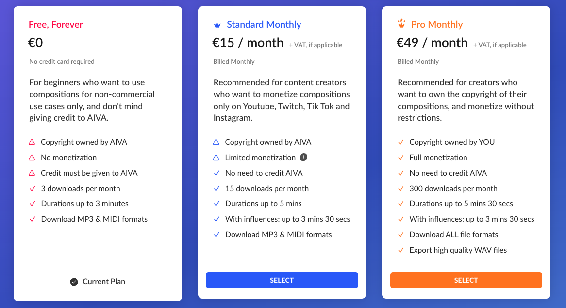 AIVA is technically free, though that comes with the caveats listed above. That said, this AI tool can be incredibly useful… so much so that the price tag is quite easily justified.