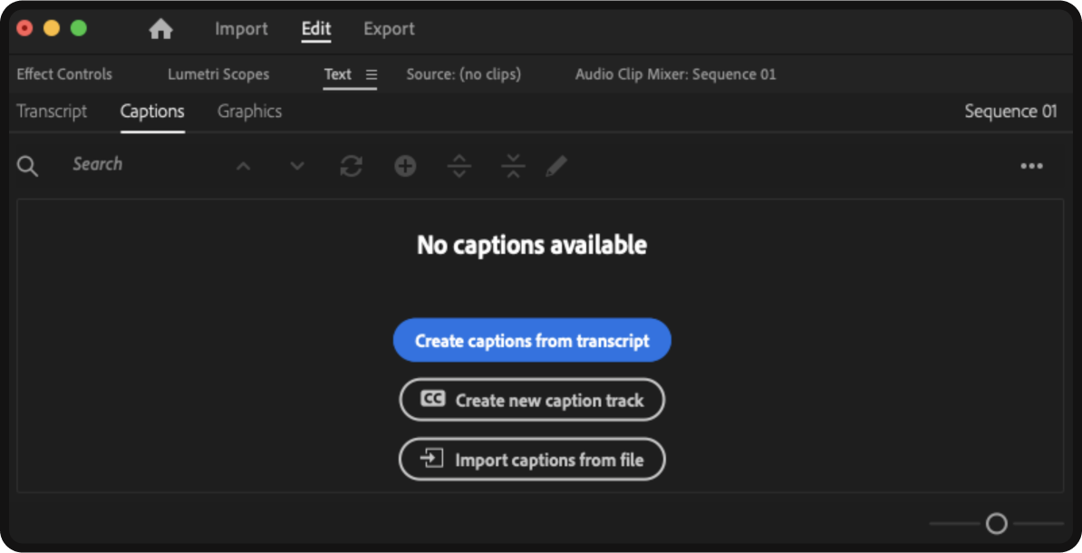 Once here, you will then click the ‘Captions’ subheading. Then, click ‘Create captions from transcript,’ and Adobe Premiere Pro will automatically transcribe & apply captions to your video content.