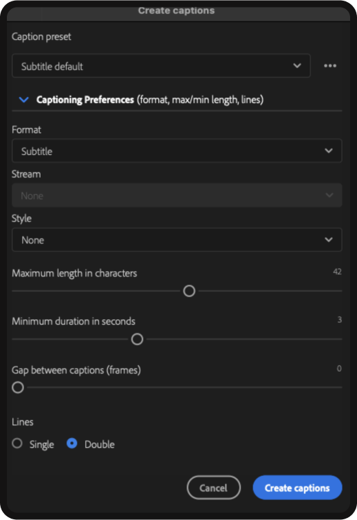 It will also present you with options to adjust to personalize your customizable subtitle settings. Once you click ‘create captions,’ Premiere’s AI will go to work. Now, since AI isn’t perfect, there will be the occasional miss-spelled word or phrase.