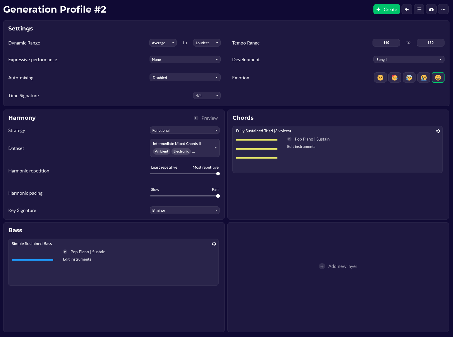 Then, AIVA will use that to generate a baseline from which you will be able to tweak aspects like the tempo, the harmony, and more! From here, all you have to do is click ‘Create’, and within minutes you will have the perfect track for your edit.