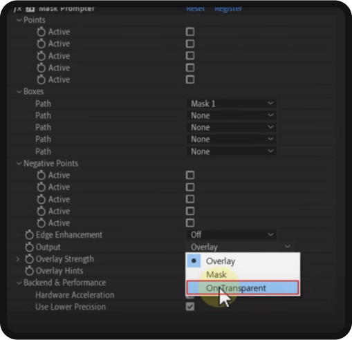 Then, to isolate the mask from its background… all you have to do is navigate down to the ‘Output’ section of the effect context menu and select ‘On Transparent.’