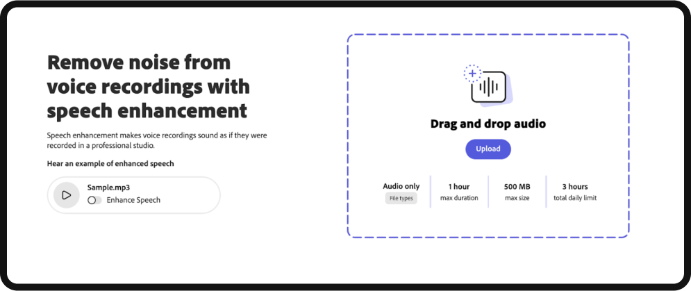 It’s as simple as dragging & dropping your audio into the upload box and waiting for Adobe to do the rest. And if you want to see it in action before you give it a go, check out this short video we made demonstrating its capabilities. From isolating speaking vocals from loud background music or unwanted video background noise to general noise reduction… Adobe has you covered here.