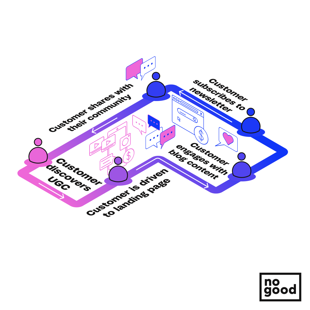 In journey two, a series of content pieces are created via UGC where the audience’s pain point is the focus. These content pieces span a landing page that the user discovers when searching for a solution to their problem, which leads them to a blog post that goes into deeper detail on how the product will help them, which encourages them to sign up for their email campaigns, which have a CTA to follow social their social media, where they regularly post content that’s relevant, informative, and engaging — and yes, there might be some ads out there too to catch the stragglers.